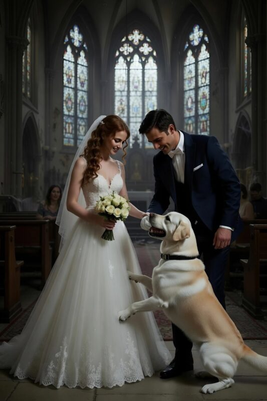 Near the front row, sitting obediently on a soft velvet cushion, was the bride’s dog — a large, shaggy brown companion named Max. He had been with her since she was a teenager, through heartbreaks, triumphs, and late-night study sessions. Today, he was more than a pet; he was family. He had sat quietly through the prelude music, following every subtle movement of his owner’s hands, and for a while, it seemed that even he sensed the gravity of the moment.