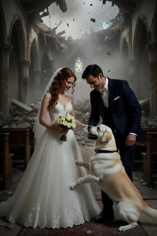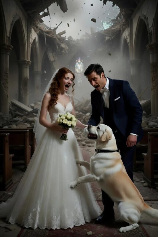 Once the initial panic had subsided, the bride and groom looked around at the remnants of the ceremony, at the fallen stones and shattered beams. The sight was sobering, a reminder of how fragile life could be. But amidst the ruin, there was an undeniable warmth — a story of courage and instinct that had changed everything. Max sat loyally at the bride’s feet, now calm, almost proud.