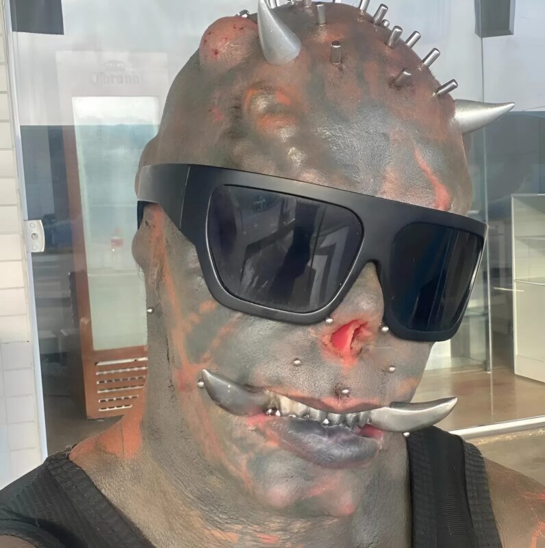 What came next shocked even the most hardened body art enthusiasts. Diabão didn’t stop at tattoos. He removed both his ears, had his nose completely cut off, amputated several fingers to reshape his hands like claws, and split his tongue down the middle, creating a snake-like fork. His nipples were removed, his teeth were replaced with chrome implants, and subdermal horn-shaped implants now protrude from his forehead—33 in total, earning him a spot in the 2023 Guinness World Records as the man with the most horn implants in the world.